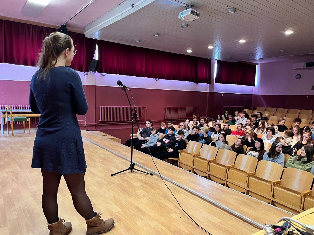 Ve středu 26. 11. navštívili žáci devátých tříd nově zrekonstruované prostory Domu kultury Ústí nad Labem. S průvodcem si prohlédli interiér budovy a poté zhlédli představeni Emil čili O Háchovi z repertoáru Divadla D21. Děkujeme za představení budovy i zajímavý divadelní zážitek. Velký dík patří i organizátorce Nicol Magrotové za pomoc při komunikaci.