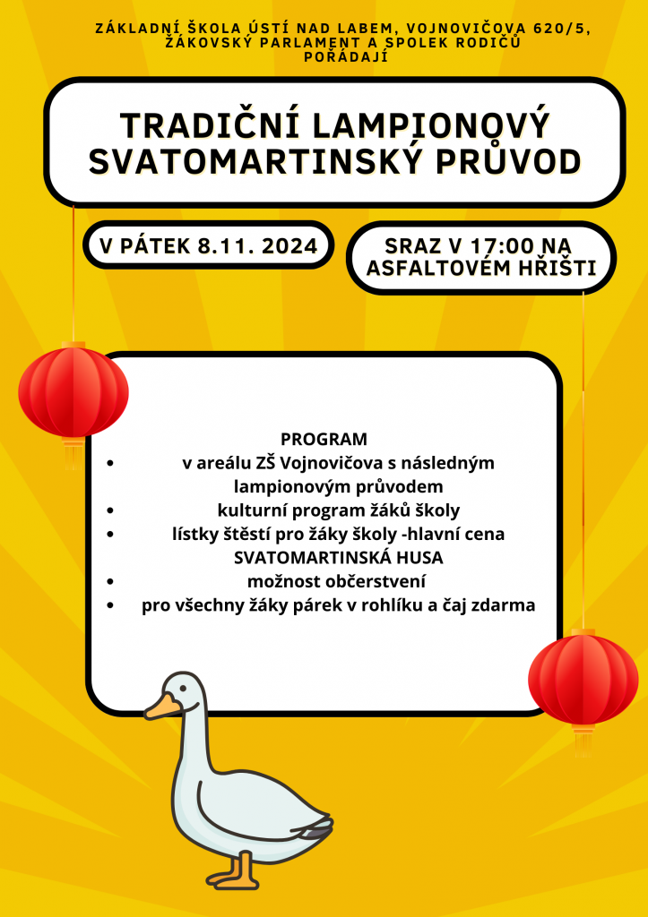 Zveme zájemce z řad naší školy na svatomartinský průvod. Sraz v 17 hodin na asfaltovém hřišti. Bližší informace rozklikněte v letáčku. Těšíme se na vás.